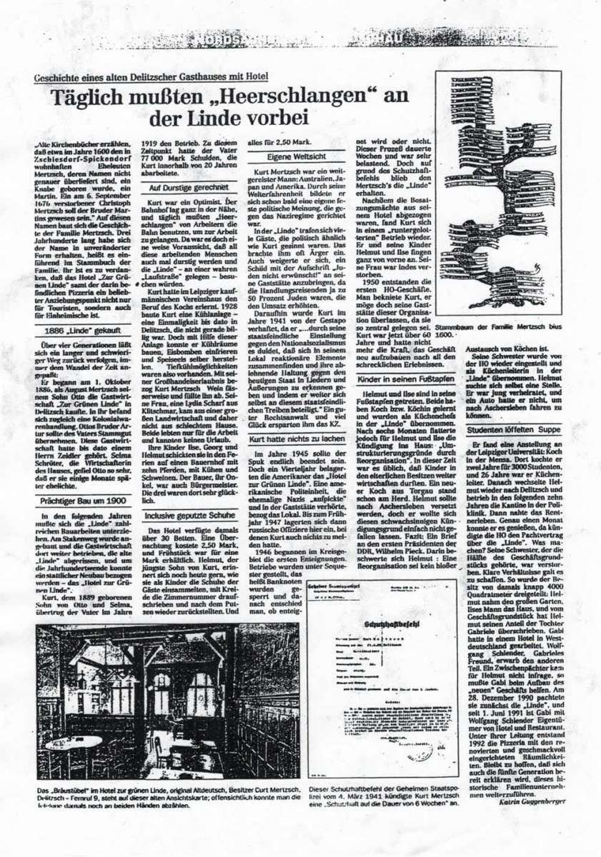 „Alte Kirchenbücher erzählen, daß etwa im Jahre 1600 den in Zschiesdorf-Spickendorf wohnhafte Eheleuten Mertzsch, deren Namen nicht genauer überliefert sind, ein Knabe geboren wurde, ein Martin. Ein am 6. September 1676 verstorbener Christoph Mertzsch soll der Bruder Martins gewesen sein.“ Auf diesen Namen baut sich die Geschichte der Familie Mertzsch. Drei Jahrhunderte lang habe sich der Name in unveränderter Form erhalten, heißt es einführend im Stammbuch der Familie. Ihr ist es zu verdanken, daß das Hotel „Zur Grünen Linde“ samt der darin befindlichen Pizzeria ein beliebter Anziehungspunkt nicht nur für Touristen, sondern auch für Einheimische ist.