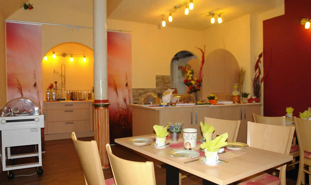 Frühstücksraum und Gaststätte mit urigem Tresen (2 Räume für je ca. 25 Personen ) und einem Saal für 20 - 65 Personen mit Terrasse im Erdgeschoss.